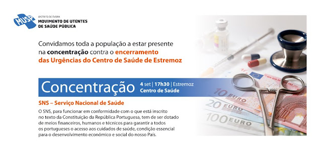 Pese embora estas declarações, o Movimento de Utentes de Saúde Pública do Distrito de Évora - MUSP está a organizar uma concentração, para a qual convida toda a população, contra o encerramento das Urgências do Centro de Saúde de Estremoz, concentração essa que decorrerá no próximo dia 4 de setembro, pelas 17.30, no Centro de Saúde estremocense.